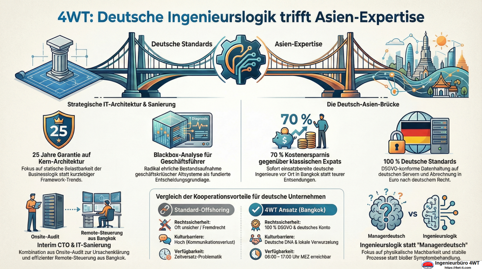 In unserem 1990 gegründeten Berliner Enterprise-Ingenieurbüro 4WT, das 2013 nach Bangkok verlegt wurde, verbinden wir technische Systemanalyse, KI-Integration und robuste Softwarearchitektur mit 18 Jahren Asien-Erfahrung.