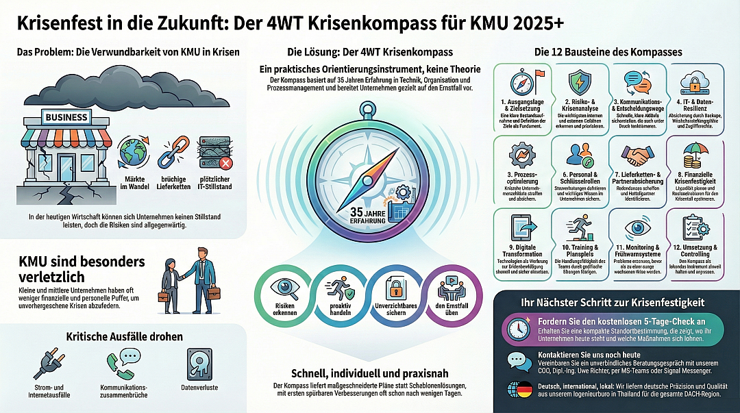 4WT Krisenkompass Teil 1: Professionelle Unterstützung für KMUs bei der Vorbereitung auf Krisen 2025+. Deutsches Ingenieurbüro in Thailand bietet praxisnahe Strategien für Resilienz gegen IT-Ausfälle, Cyberangriffe & mehr – für autarke Betriebsfähigkeit.