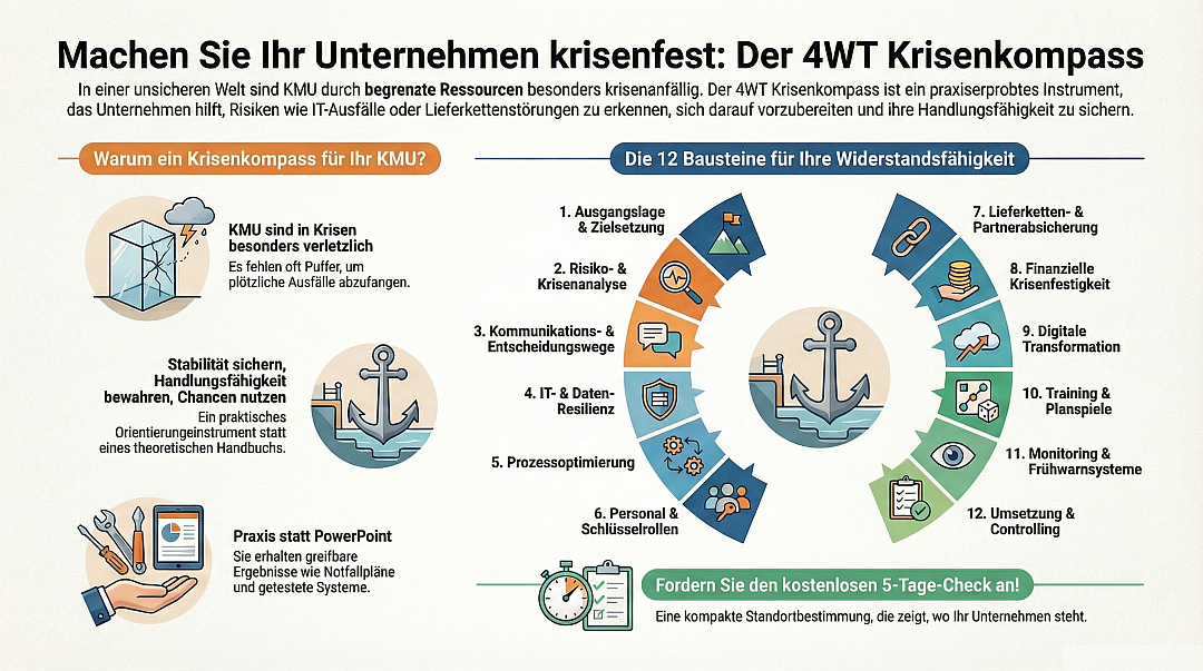 4WT-Krisenkompass 5 Tage Check (Der 4WT Krisenkompass zeigt Ihnen Lösungen für KMUs, wie Ihr Betrieb mindestens 5 Tage autark bleibt – trotz IT-Ausfall, Stromausfall, Cyberangriff oder Kommunikationsstörung.)
