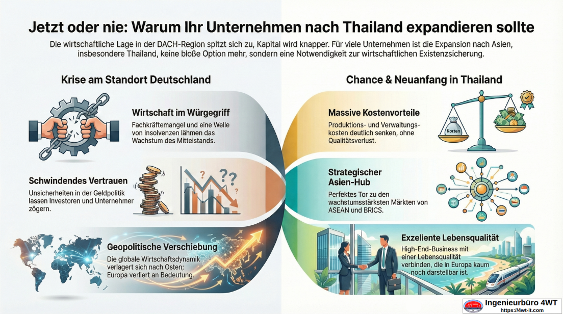 Warten Sie nicht, bis das Kapital vollständig aufgebraucht ist. Thailand ist bereit für Ihr Business. 4WT sorgt dafür, dass die Landung weich und der Start in Asien erfolgreich verläuft.Planen Sie Ihre Expansion professionell – mit einem Partner, der die Praxis vor Ort kennt, vereinbaren Sie noch heute ein unverbindliches Erstgespräch.