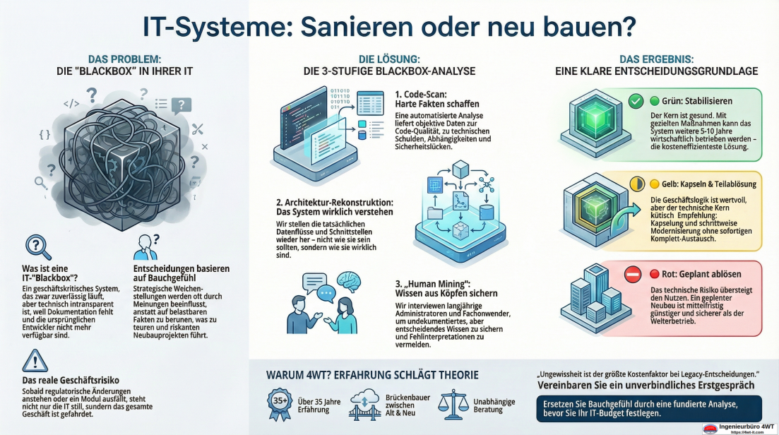 Das technische Risiko übersteigt den Nutzen. Ein geplanter Neubau oder die Migration auf Standardsoftware ist mittelfristig günstiger als der Weiterbetrieb.5. Warum 4WT? Erfahrung schlägt Theorie