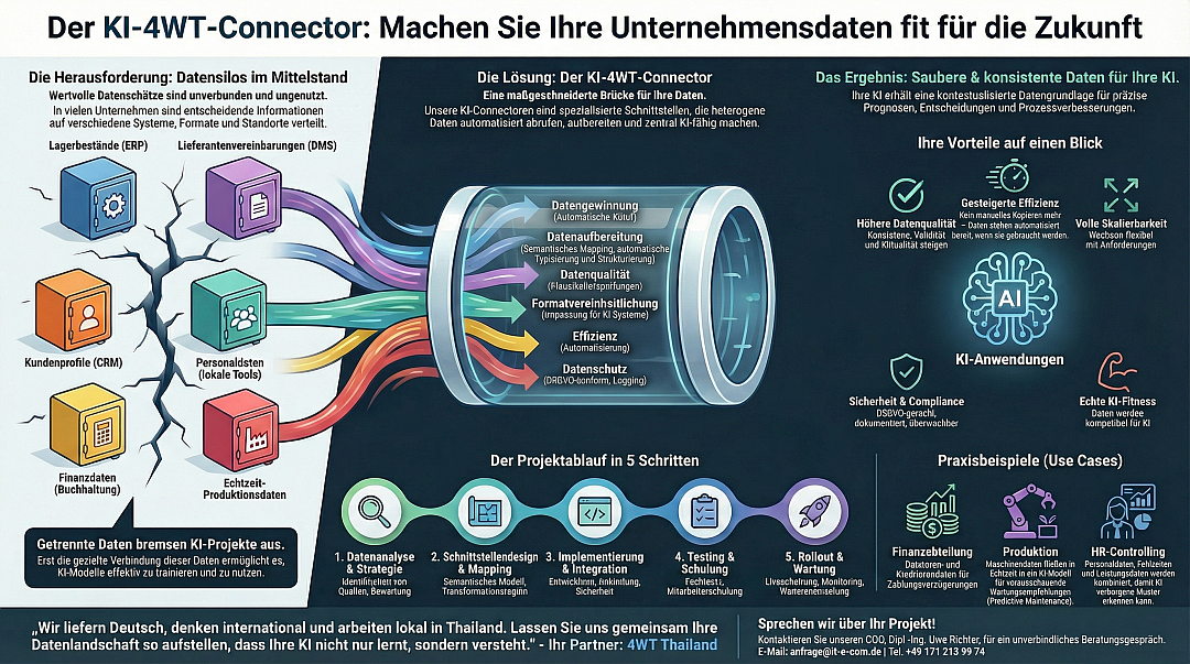 KI-4WT-Connector für KMU: Daten aus ERP, CRM, DMS & Produktion automatisieren, aufbereiten & KI-fähig machen. Höhere Datenqualität, Echtzeit-Schnittstellen, DSGVO-konform. Deutsches Ingenieurbüro Thailand schafft Grundlage für erfolgreiche KI-Projekte!
