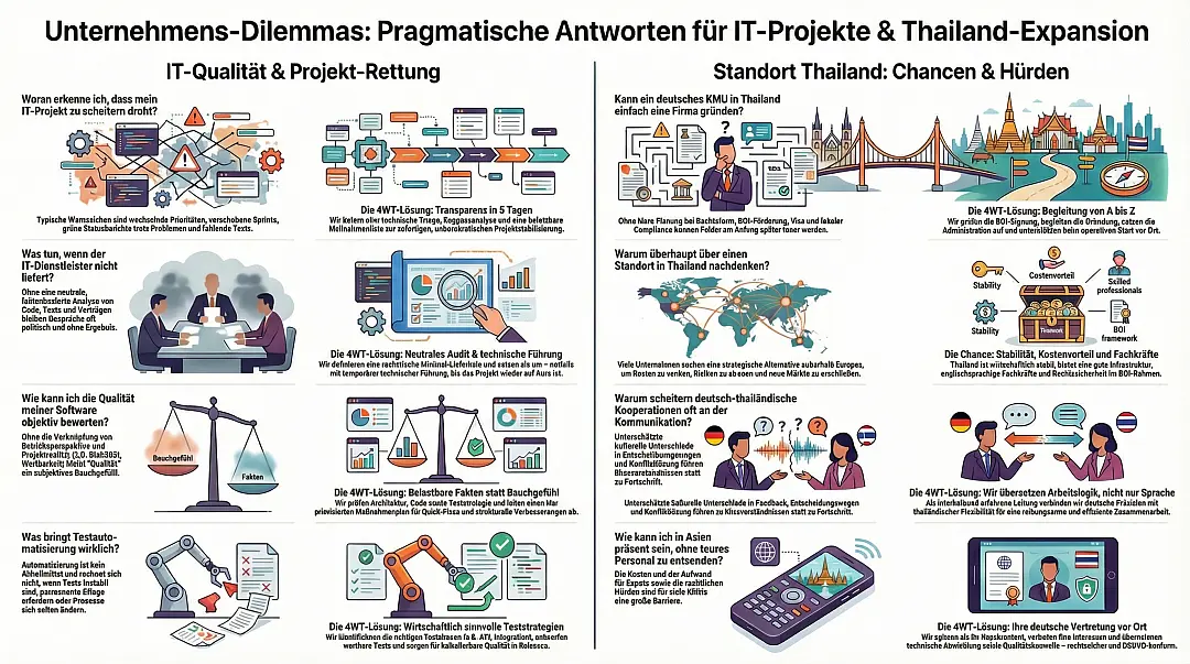 Was 4WT tut: Wir übersetzen nicht nur Sprache, sondern Arbeitslogik: deutsch-präzise Struktur trifft auf thailändische Flexibilität. Ergebnis: Projekte, die wirklich funktionieren – beidseitig respektvoll und effizient.