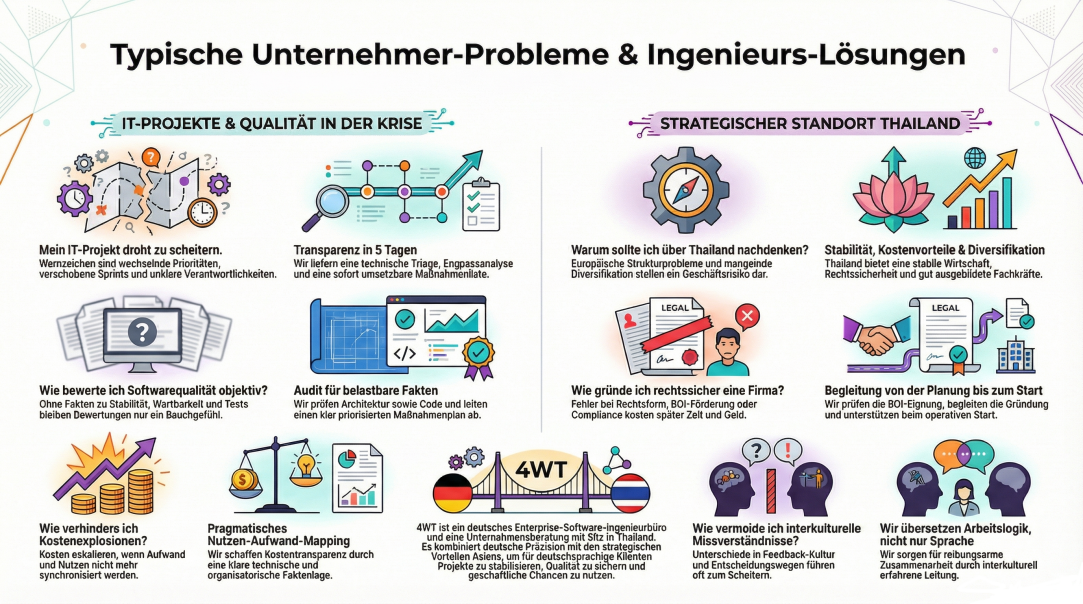 In unserem Ingenieurbüro 4WT in Thailand verbinden wir technische Systemanalyse, KI-Integration und robuste Softwarearchitektur mit 15 Jahren Asien-Erfahrung.