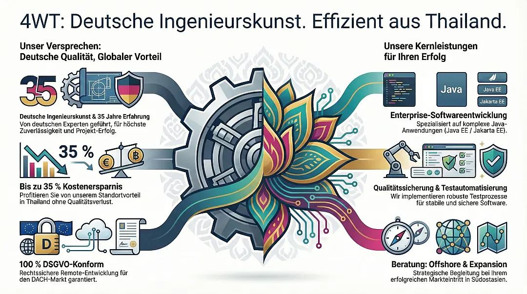 Berliner Enterprise-Softwareentwicklungs Ingenieurbüro und Unternehmensberatung 4WT in Thailand: Strategischer Partner für CEOs im Mittelstand. Kosteneffiziente Java Enterprise-Softwareentwicklung, Java EE, Jakarta EE,Test und Qualitätssicherung & Offshore-Outsourcing Unternehmensberatung – 100% DSGVO-konform. Kontaktieren Sie uns!