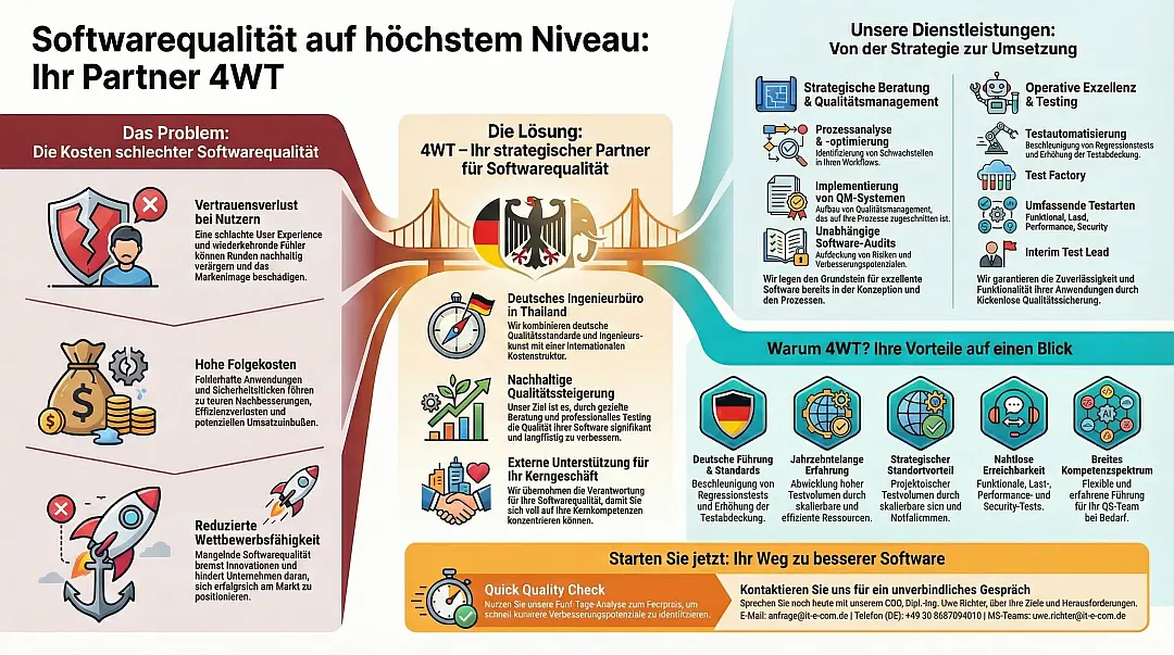 4WT: Ihr deutscher strategischer Partner für IT-Qualitätsmanagement & Software-QS aus Bangkok. Externe deutsche Unterstützung steigert Qualität nachhaltig – Testdienstleistungen, Beratung & Fehlervermeidung für DACH-Unternehmen. Konzentrieren Sie sich auf Ihr Kerngeschäft!
